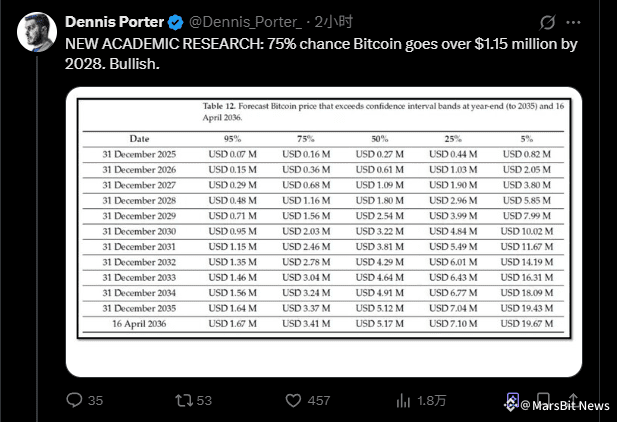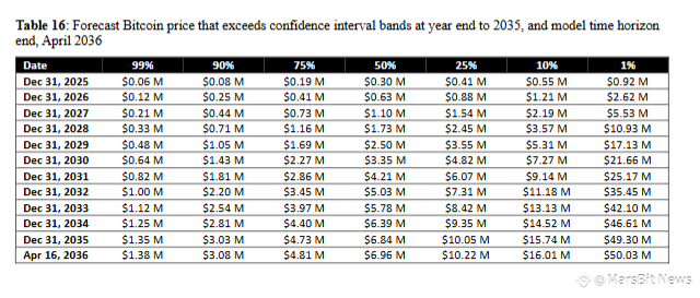 当2100万枚的固定上限遇上持续增长的机构需求,价格可能进入非线性增长阶段。75%概率指向2036年的481万美元,但更重要的是沿途的路标,例如2028年的100万美元,2030年的335万美元。