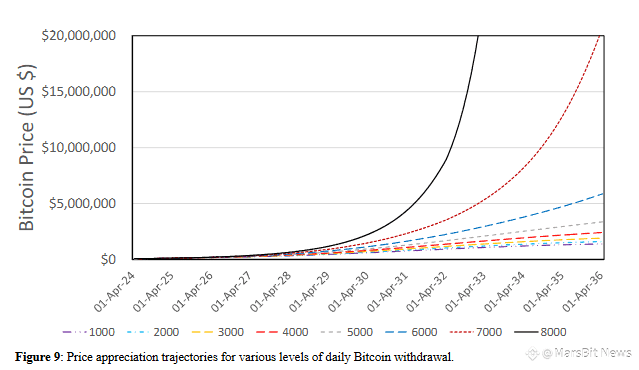 研究通过模拟不同的每日BTC退出流通的数量发现,当市场上可交易的比特币少于200万枚时,每一笔新买单都会显著推高价格,而价格上涨又激励更多人囤币不卖,形成自我强化的正反馈循环。