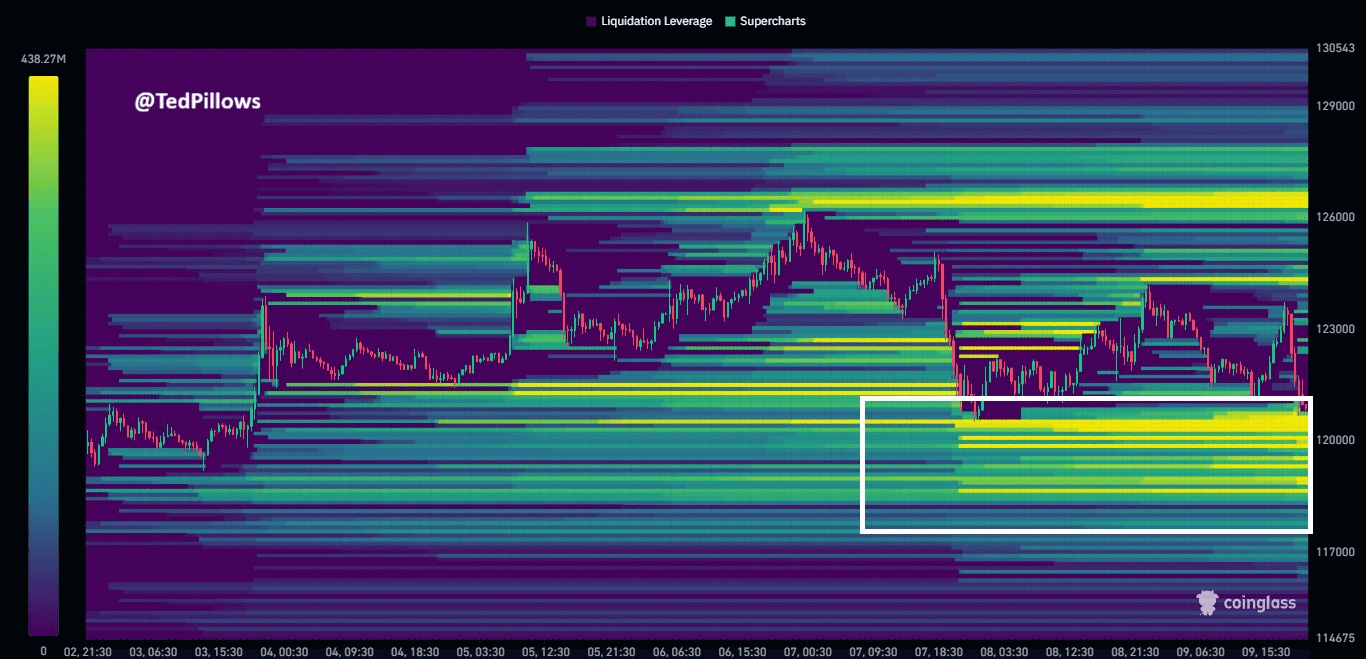 加密貨幣分析師Ted Pillows指出,11.8萬美元附近是關鍵的流動性區域,並警告稱,該水平可能引發劇烈波動。他指出,“數十億美元的多頭倉位”聚集在該區域附近,如果這些倉位被平倉,可能會引發一連串的拋售。