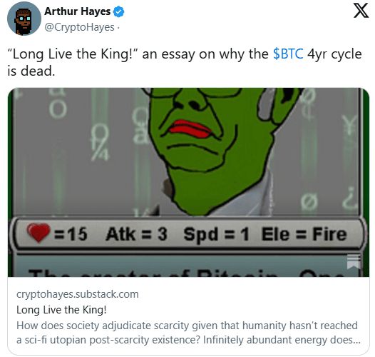 傳奇加密投資者和BitMEX創始人亞瑟·海耶斯認爲,著名的四年比特幣週期——長期以來被視爲市場的脈搏——已正式結束。