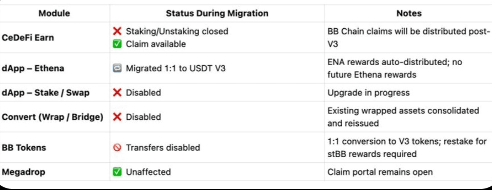 CeDeFi Earn,dApps(Ethena,Stake,Swap),Convert(Wrap/Bridge)和所有BB代幣轉賬將在遷移期間被禁用。