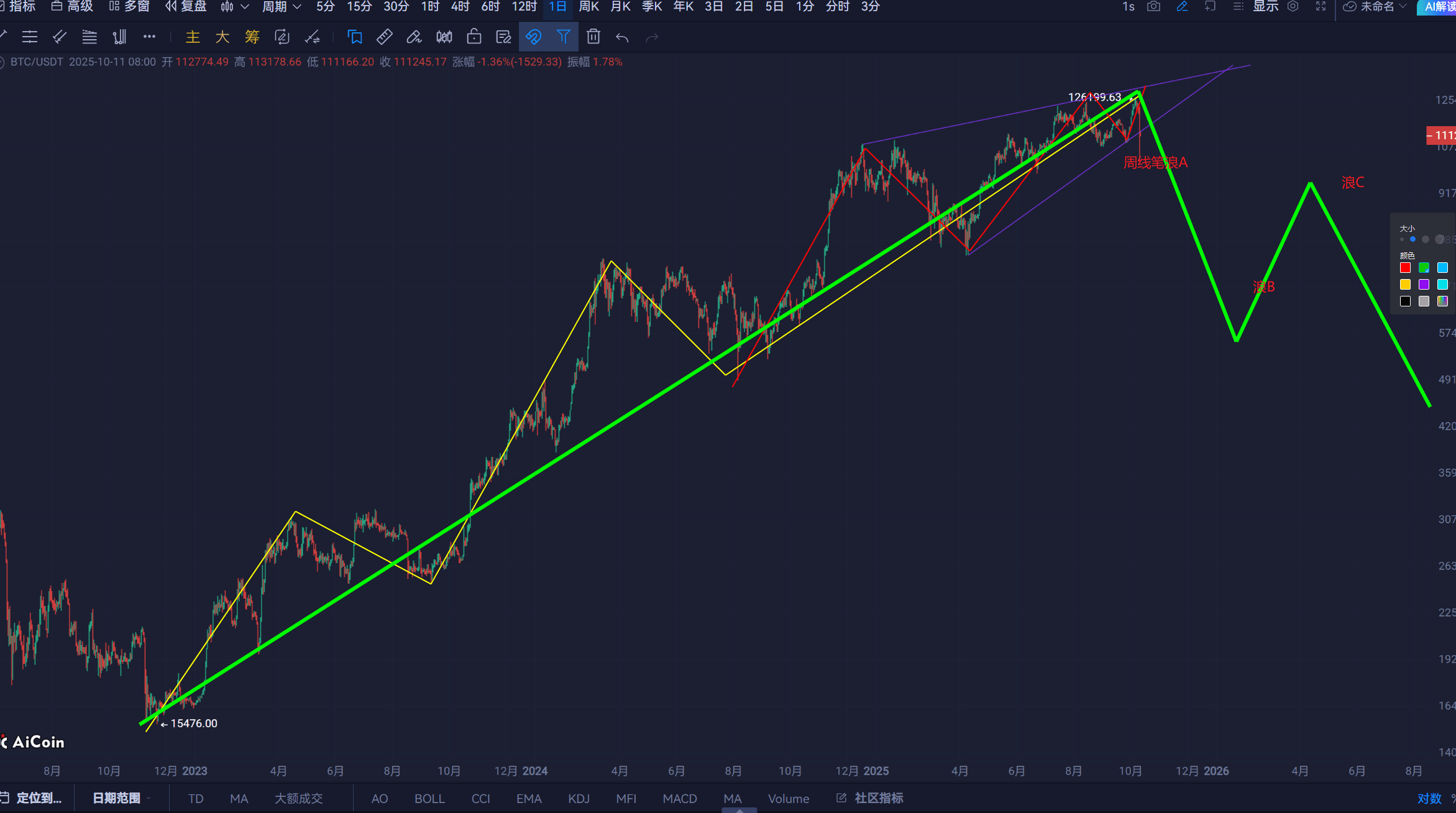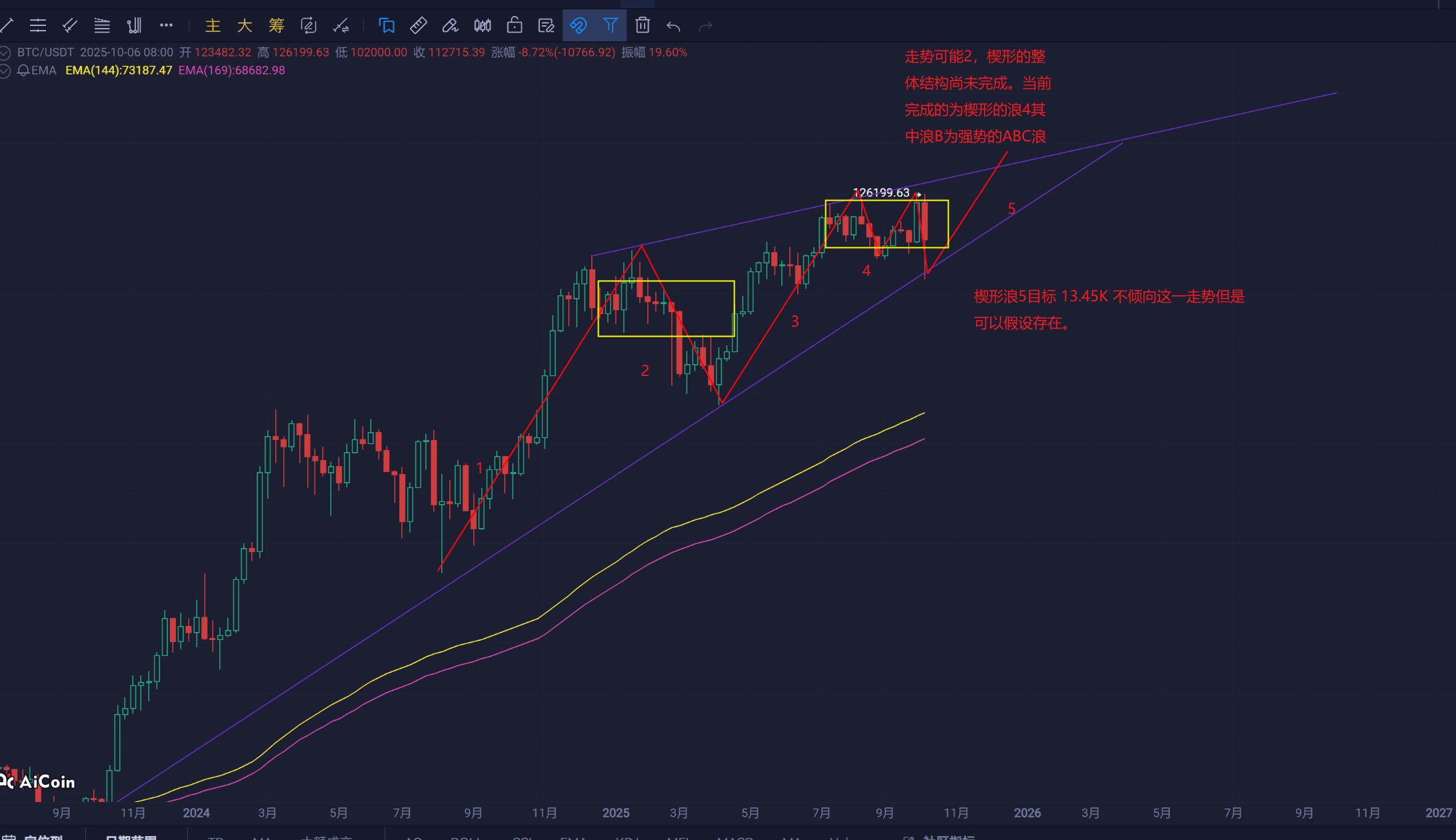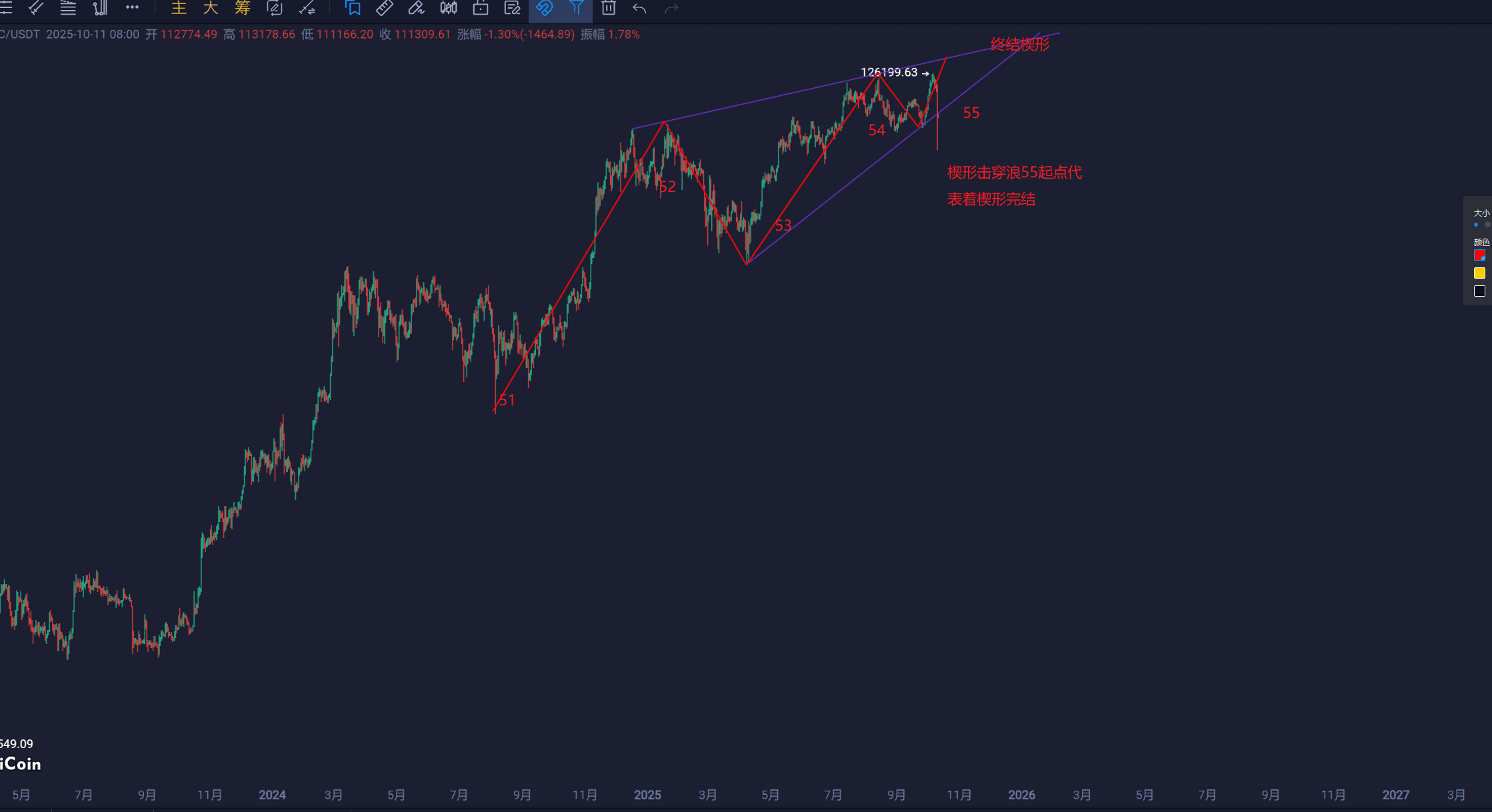 在十月初提出過新一輪的假設 ,假設從49000以來的走勢爲浪5延長浪 終結楔形走勢。(終結楔形概述:終結楔形,全稱爲 “艾略特波浪終結楔形”,是艾略特波浪理論中一種特殊且重要的調整浪或推動浪形態,主要出現在趨勢尾聲,標誌着當前方向的趨勢即將終結,後續大概率發生反轉。它的核心特徵是 “價格波動幅度收窄 + 成交量逐步萎縮”,呈現出明顯的 “楔形” 收斂結構,是實戰中判斷趨勢拐點的關鍵信號之一)