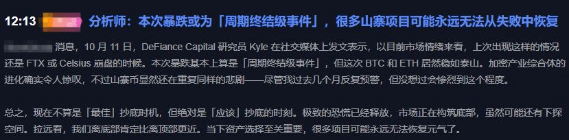 更值得琢磨的是圈內信號——DeFiance Capital研究員Kyle昨天發帖直戳痛點:“這輪暴跌,情緒像極了FTX、Celsius崩盤時!”他甚至下了狠話:“本次或成周期終結級事件,很多山寨項目永遠爬不起來了。”