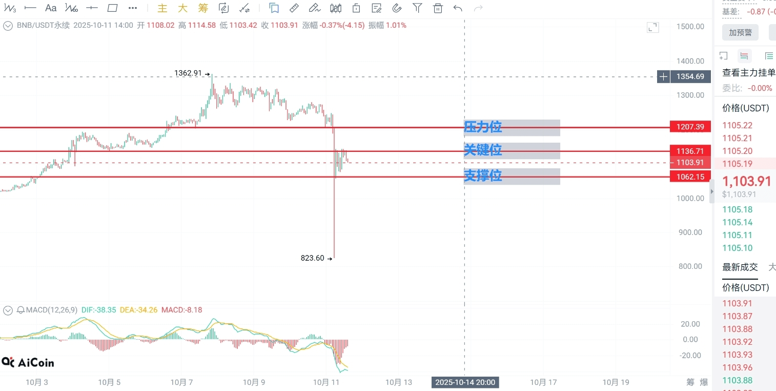 打開BNB1小時圖,最近走勢先漲後跌,最新收在1103,小跌0.37%。表面看跌幅不大,但圖中三個關鍵位得盯死:壓力位1207、關鍵位1136.71、支撐位1062.15。