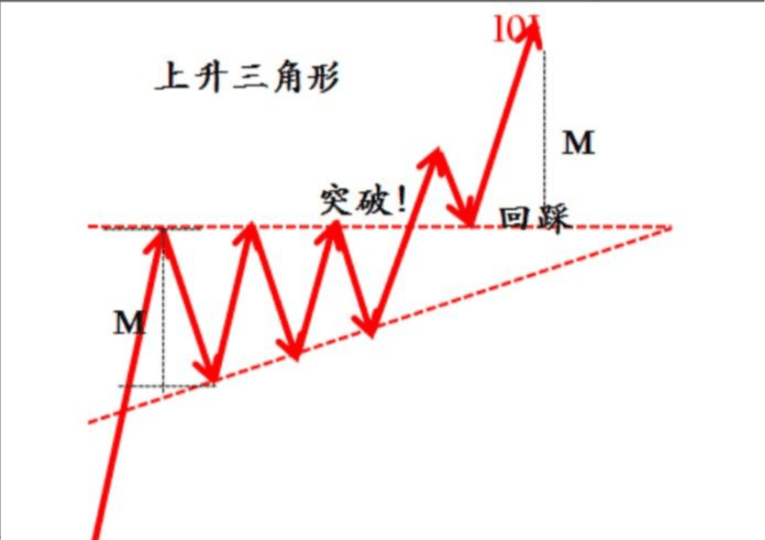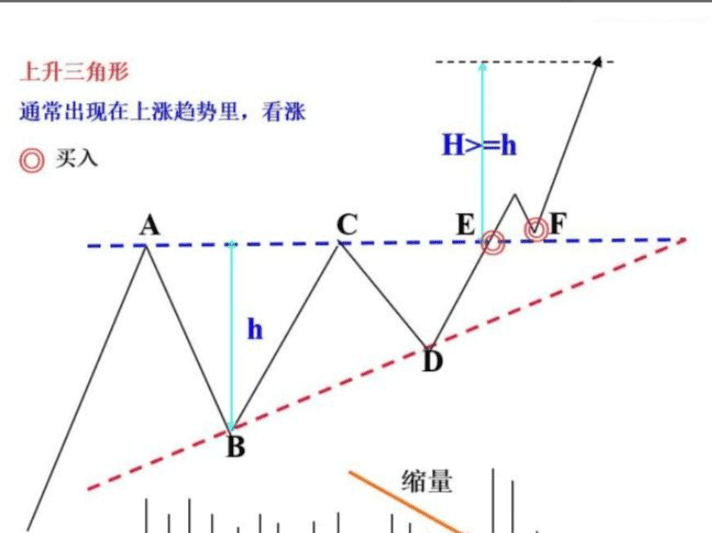 1)在上升三角形中,股票超買,價格反轉回落。隨後,買盤重新進入市場並且價格很快達到歷史高點,達到高點後再次回落。隨後買盤會重新出現,儘管價格會比之前的更高。【說明市場的購買意願較強,表現爲三角形下沿低點在擡升】