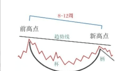杯柄模式是在股票強勁上漲後的調整形態。一般來說,一隻股票會有大約2到4個月的劇烈波動,然後通過市場調整,回調時該股將遇到拋售而下跌,較前高點下跌約20%至35%,調整的時間一般在8到12周之間,這取決於整體的市場狀況。當股價上漲試圖挑戰前高點時,就會受到那些在前高點處或附近買入的人的賣出壓力。這種賣壓將使股價帶來下跌和橫盤整理,時間大概是4天至3周。手柄的部位通常比前高點低5%,若是較低的手柄通常是有缺陷的股票,也意味着較高的失敗風險。