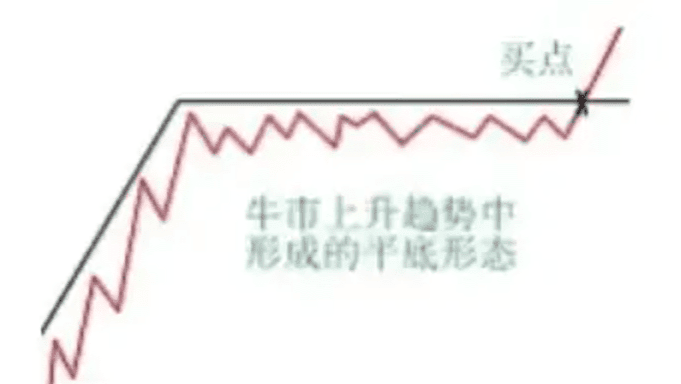 平底是一種在任何時間跨度內水平移動的圖表模式。這個模式形態可以獲得非常強勁的上漲,我們要尋找的是,當股票價格保持在水平或大致相同的水平,並且成交量出現枯竭,在這個平底的頂部畫一條趨勢線,當股價突破趨勢線並且成交量放大時買入。【先有縮量,然後放量突破】