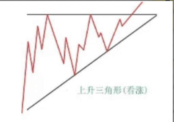 上升三角形是對稱三角形+的一種變體,通常被認爲是在上升趨勢中最可靠的看漲形態。三角形的順部是平的,而三角形的底部則是向上傾斜的。【高點基本是水平,底部不斷擡升】