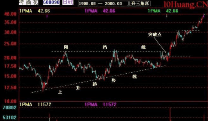 。每一個新的較低的高點和較高的底部,變得比前面更窄,形成一個側面三角形的形狀。(在這段時間裏,成交量有下降的趨勢。)最終,這種優柔寡斷會結束,通常會從這種形態後開始爆發(通常是在鉅額成交量的情況下)。研究表明,對稱三角形會壓