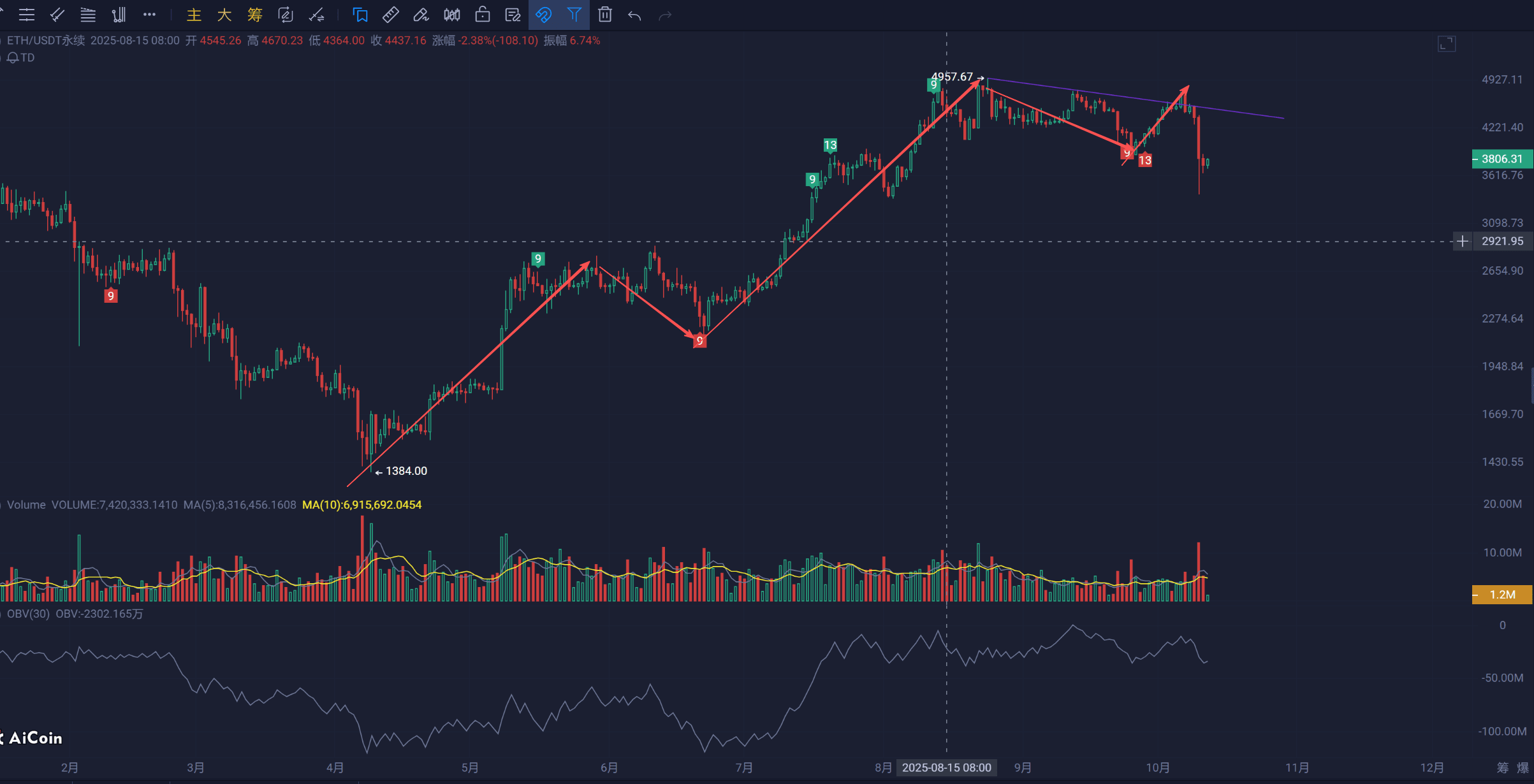 ETH: 輪動 大餅 走勢很弱 後期我覺得也很難走出獨立行情。支撐:3.4-3.5K上下 壓力1小時 4.215K ETH結構上看作衰竭的浪5見圖3