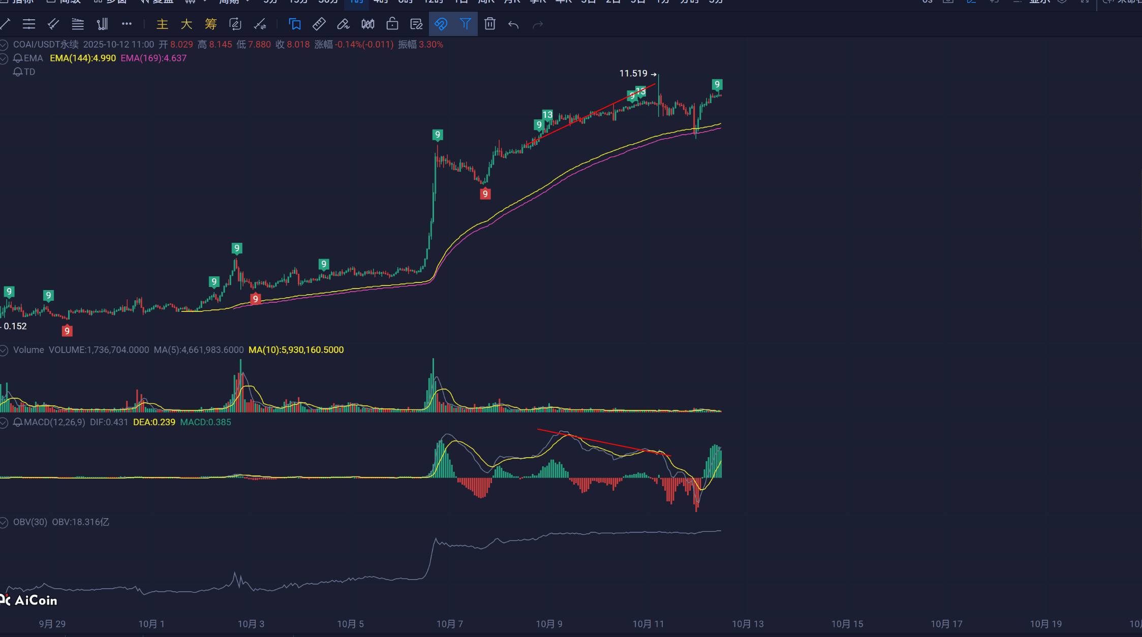 COAI:各種背離 主力垂死掙扎 砸盤砸盤全看主力的建倉情況。 這玩意適合小資金當保證金來賭崩盤 圖6