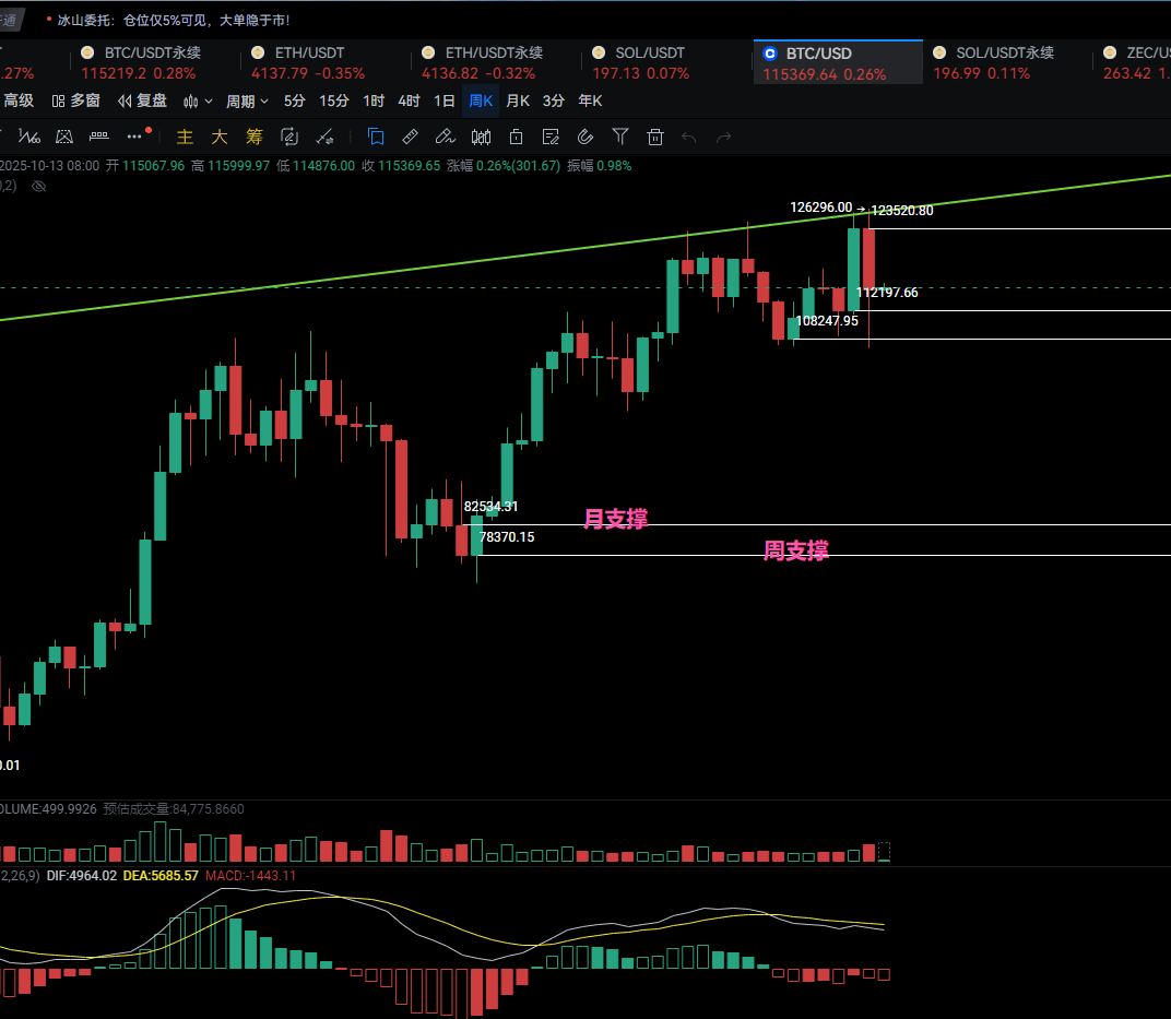 周線,剛剛收周線了,k線上,又往趨勢線壓力插針,大陽後收大陰,這就是見頂信號,壓力位下方的大陽都是誘多的。目前周線的支撐在112197,壓力在123520,按照慣性,本週應該會往支撐插一下。成交量上,陰線的量快到陽線的兩倍了,這就是頂部特徵,不要再幻想去什麼15萬了。macd上看,上上週大陽好多人看macd要金叉了,覺得還要漲?現在呢,金叉一定漲死叉一定跌嗎?反例太多了,還是以k線爲主啊,指標只是輔助。況且周線macd是背離的,可以去覆盤btc的周線,牛市和熊市頂背離和底背離都只出現一次,所以說,一旦周線出現頂背離,就是見頂了。再強調一點:k線決定了macd的走向,而不是macd引領k線在走,不要本末倒置。macd最重要的應用就是背離,金叉死叉少看。對了,周線收大陰,方向向下。