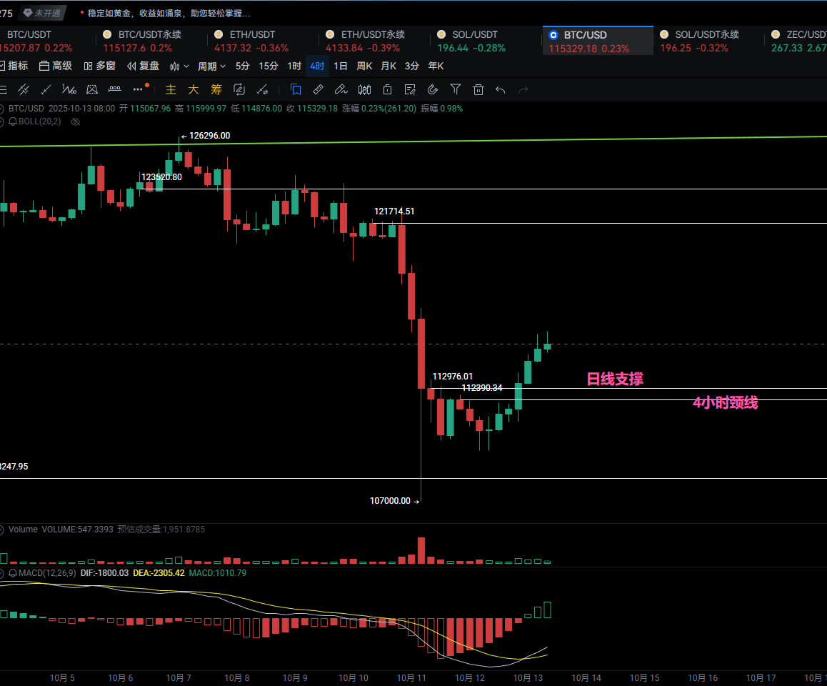 日線,收大陽線,反包陰線,方向向上,看看能不能回踩112976給個上車機會,還有一個支撐是112390,4小時頸線位,因爲4小時有底部結構了,所以是逢低做多思路,看121714,123520。不要想兩頭喫,就是做多,4小時沒有頂部結構就一直拿着。日線4小時都是方向向上。