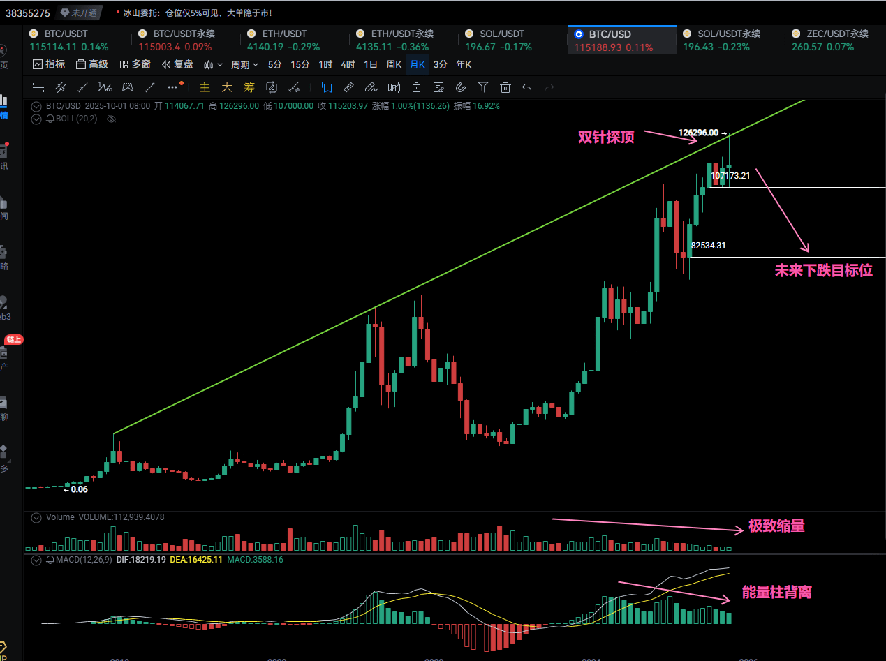 月線,k線上收出雙針探頂形態,見頂信號,107173支撐沒破,又反彈向上插針,有人說了都見頂了爲什麼還沒有大跌,你判斷的不對吧。別急啊,它要在這橫盤築頂出貨啊,還是那句話,橫有多長,豎有多高。這輪牛市從23年1月開始,漲了兩年多,鑄頂的時間也要長一些,莊家底部吸了那麼多籌碼,不是一天兩天可以出完的。成交量上看,連續12個月縮量,非常危險的信號,巨大的漲幅後縮量是買盤不足,見頂信號。macd上看,快慢線歷史高位,能量柱背離,位置越高風險越大,強弩之末。由於上月收中陽,且實體超過前一根陰線一半,是看多的,方向向上,但是之前已經出現見頂k線且壓力位沒有突破,所以是看多不做多的。大膽預測一下,做頂結束後下跌的目標位在825000,月線不可能沒有下影線,所以有可能會插針到周線支撐78370,總之我看8萬附近。