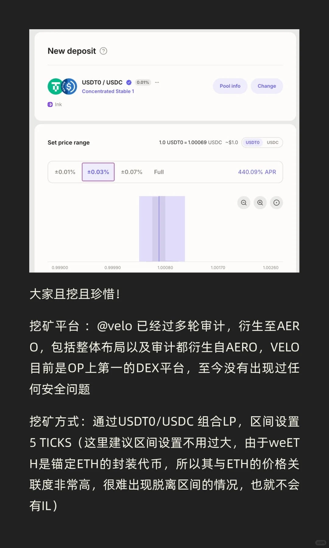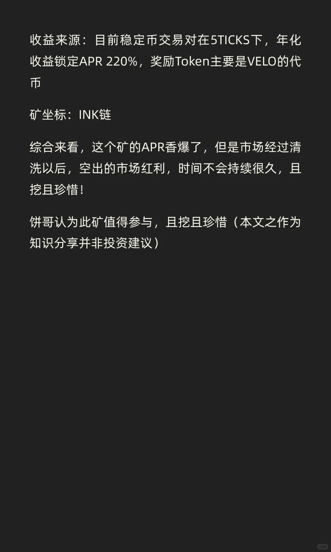 SUI链神矿多!!APR超过28.5%的稳定币神矿 今天这座神矿! 超过28.5%apr的稳定币矿,属于SUI链上最大的DEX平台,此矿已经挖了1年左右,估计时间不会持续很久,且挖且珍惜! 挖矿平台 :@CETUS 已经过审计 挖矿方式:通过FUSD/USDC 组合LP,区间设置在10 TICKS,约合总波动率在0.1%(如果区间设置更窄,最高收益率可达35%!!但是此时无常风险产生的概率较大) 收益来源:目前交易对在10TICKS下,锁定APR 27%,奖励Token主要是CETUS平台的token奖励➕SUIToken奖励➕gas fee收益 风险:CTUES之前被黑客盗取过200M刀,但是SUI项目方及时采取了链上暂停措施,所以补救了65%,同时提供贷款给CETUS,所以本次被盗事件,用户损失不多。后期cetus采取了更加严格的审计手段,算是浴火重生的DEX平台 矿坐标:SUI链 稳定币构成:FUSD是一比一锚定的稳定币,平台经过第三方机构审计,整体流动性池非常厚,算是币圈头部稳定B之一,FUSD的底层由现金构成,脱锚的概率极低 总结:这个矿的Apr还算不错,其主要来源在于平台的补贴和SUI链的补贴,cetus想抢占SUI链上TVL第一的DEX,所以才会用自己的代币进行大规模激励 ,也是SUI链吸引用户进入的手段之一 饼哥认为此矿值得参与,而且此矿不会持续很久,且挖且珍惜(本文之作为知识分享并非投资建议)