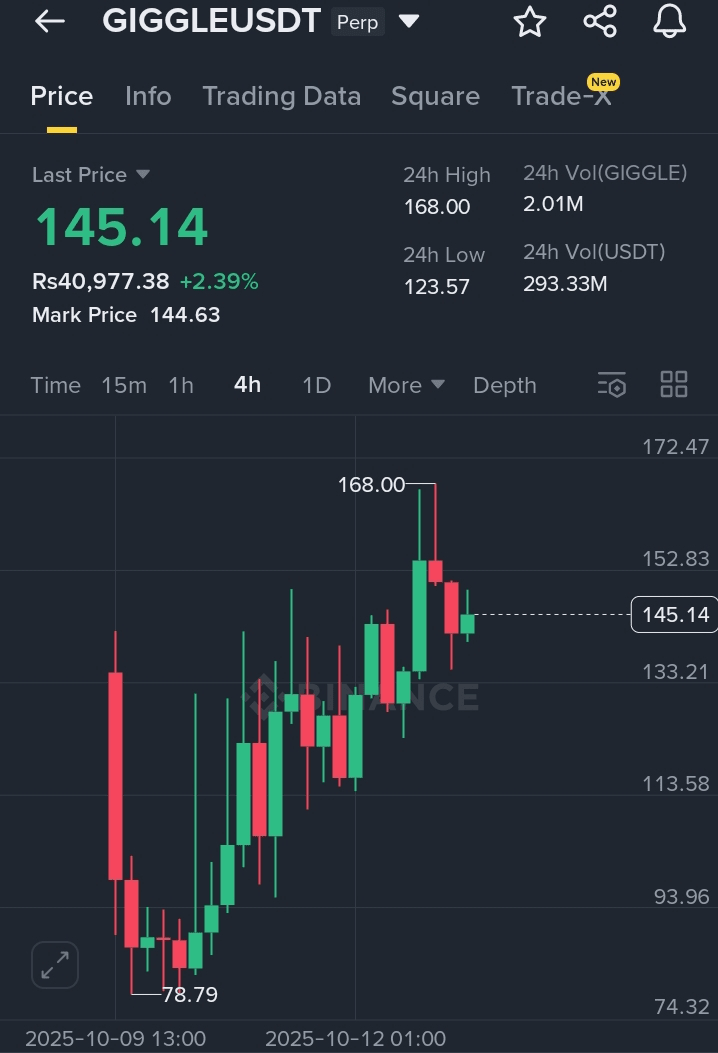 E. 市場分析: GIGGLEUSDT 的日線圖顯示出非常強勁的上漲趨勢,從低於 $80 快速上漲至 $168。4 小時圖表表明在達到高峯後出現短期回調或整合。在這一整合期間,成交量的下降表明賣壓正在減弱,這可能意味着上漲趨勢可能會恢復。