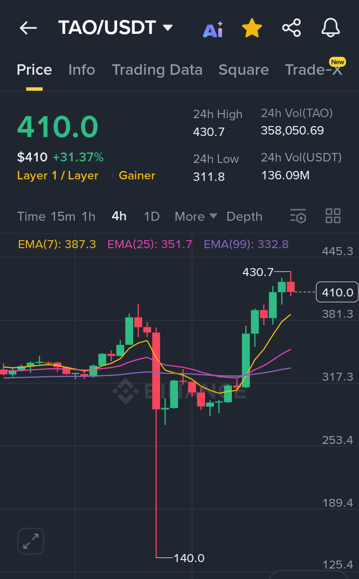 截至 2025 年 10 月,TAO 的交易價格約為 $295–$371,市值接近 $30 億。其在 2024 年 4 月創下的歷史最高價 $767 反映出強勁的投資者興趣,而其流通供應量為 1000 萬 TAO,最大供應量為 2100 萬,保持了稀缺性。