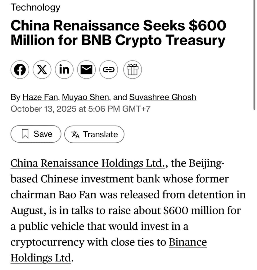 ไธญๅ่่ณ้่ก โChina Renaissanceโ ่ YZi Labs ๅไฝ้ฒ่ก 600 ่ฌ็พๅ ่่ณ๏ผๆบๅๅจ็พๅ่กๅธไธๅธไปฅ่ณผ่ฒท BNB ๅขๅ ๆ่ณ๏ผ