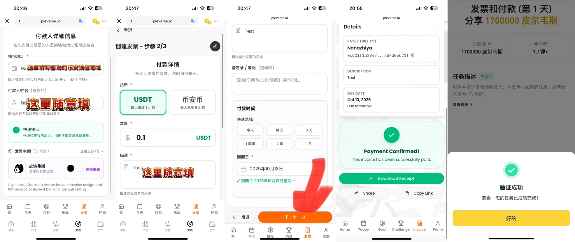 👩🏼‍🏫點擊➕Create Invoice ,填寫朋友的幣安錢包USTD地址,其他資料可以隨意補充,然後支付(支付的時候要開一下🪜,不然好像卡着轉不出去),付款成功後等個幾秒鐘去驗證。