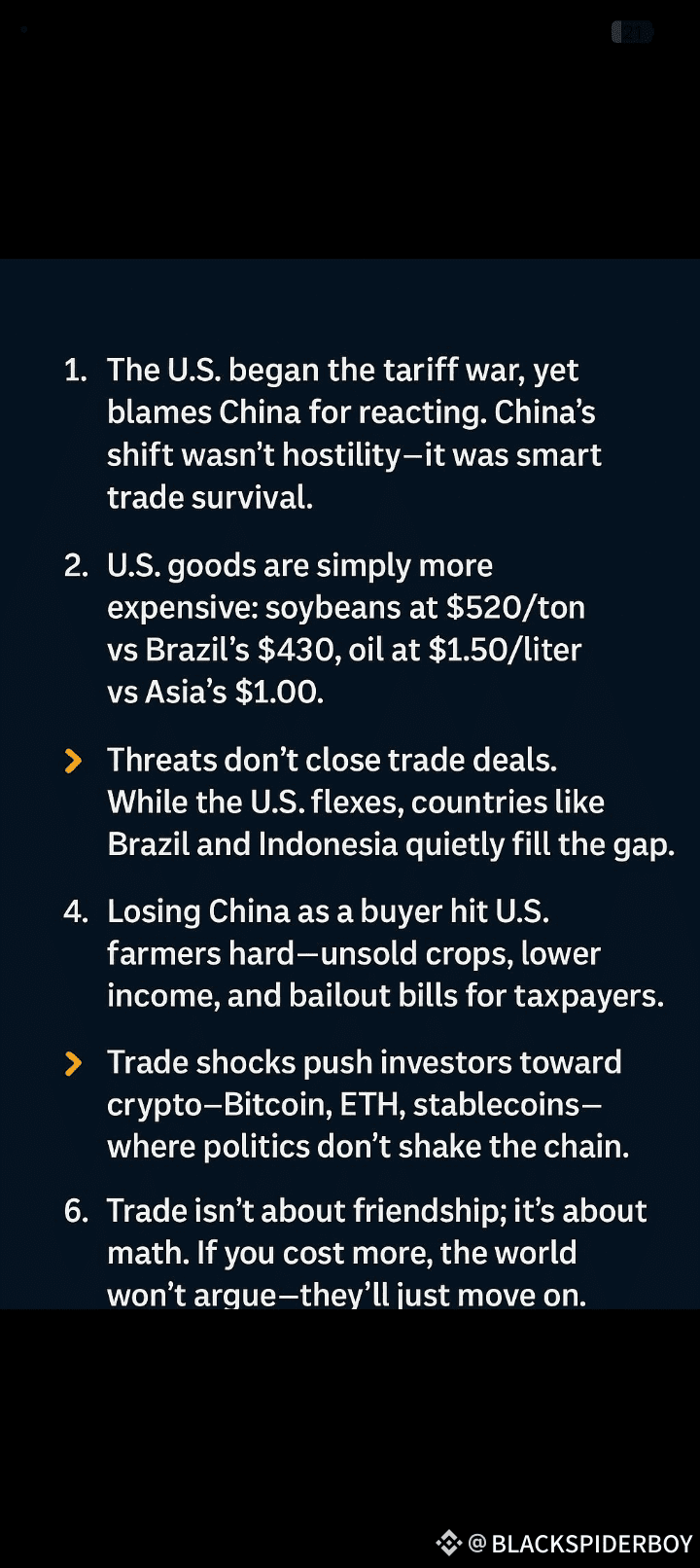 5. While Tradewars Burn, Crypto Stays CoolEvery trade shock — from soybeans to cooking oil — quietly nudges investors toward crypto. Borderless, neutral, and resilient. Bitcoin, ETH, stablecoins — no tariffs, no tantrums.