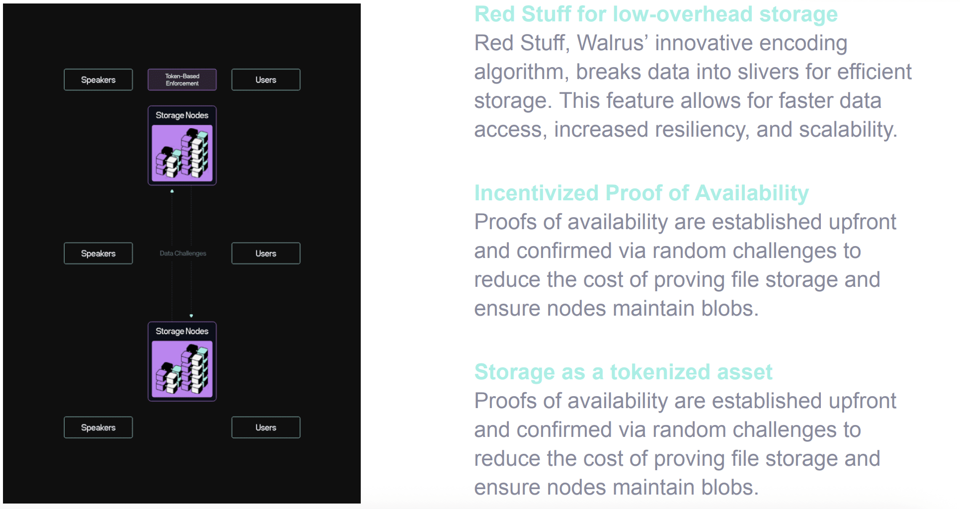 Dữ liệu sẽ được đảm bảo và duy trì tính khả dụng ngay cả khi 2/3 node sập và đưiọc hỗ trợ mã hóa kèm kiểm soát truy cập , saui đó phần dữ liệu trở thành tài sản có thể kiếm tiền qua token WAL.