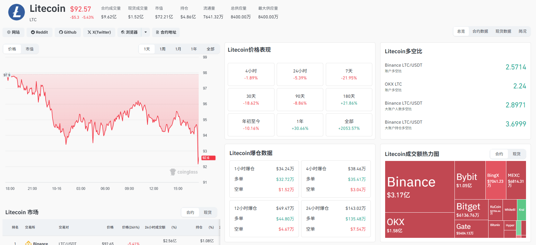 LTC在95關鍵位形成對稱三角收斂,這是典型變盤前兆!