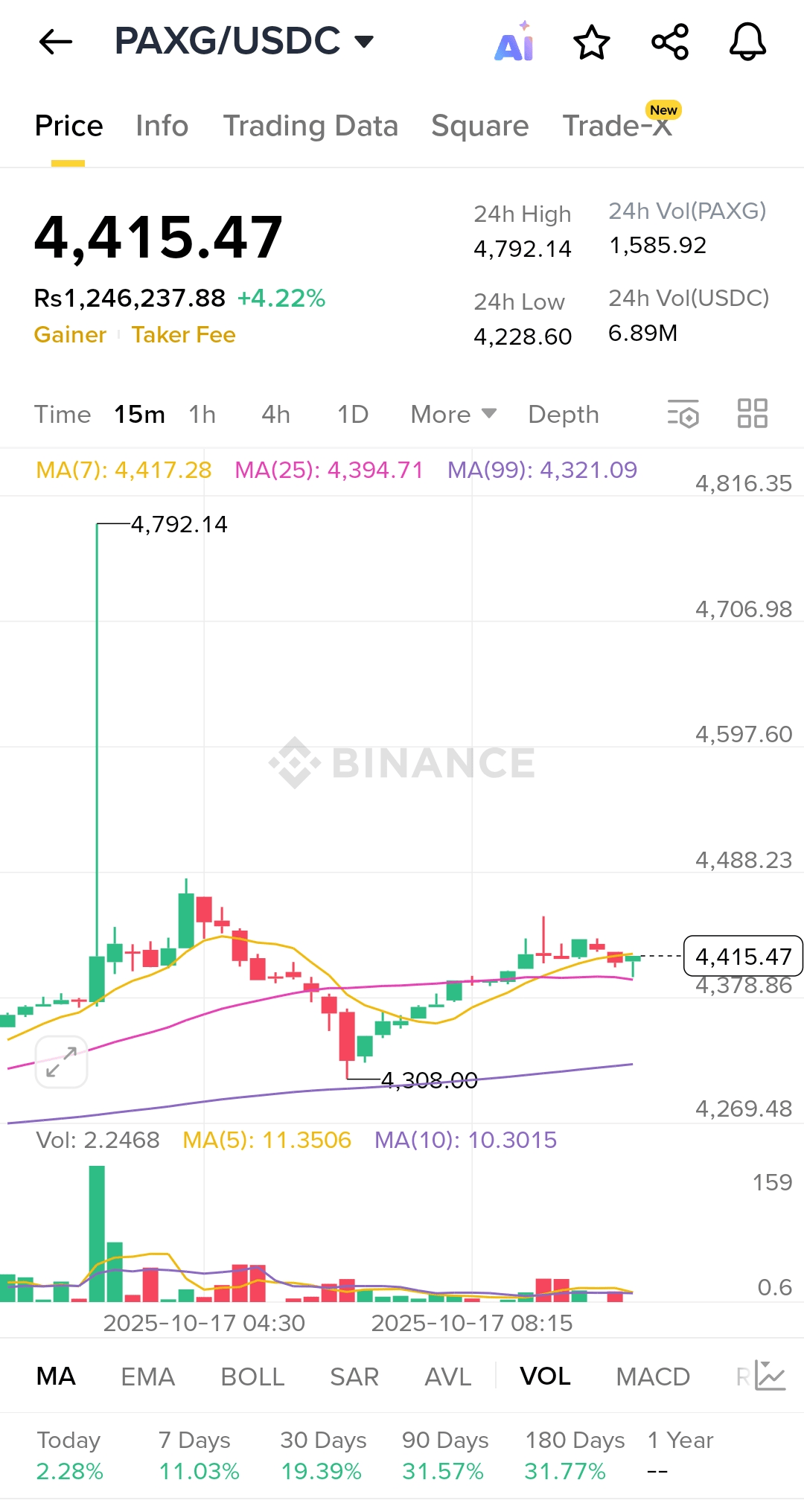 然而,若收盤低於 $4,264,即23.6% Fibonacci回撤位,可能會引發廣泛的獲利了結。強勁的支撐位在 $4,300,隨着OKX在10月15日推出PAXG/USDT現貨交易,新的動能正在形成,進一步推動了Binance在2024年推出的黃金支持加密貨幣的便捷訪問。