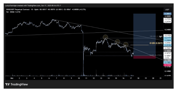 ● Trader Lucky Chart Ape 最近注意到 DOGE 達到了一個關鍵技術點,價格走勢測試了最後一條局部支撐線。多次未能突破阻力水平的嘗試突顯了當前看漲結構的脆弱性。