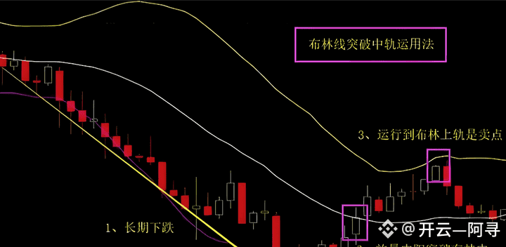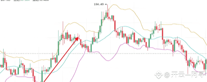 1、当K线从布林线中轨线以下向上突破布林线中轨线时,预示着币价的强势特征开始出现,如果量能有效放大,不失为好的买点。