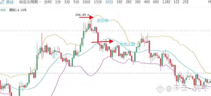 阳线涨至上轨压力处,短级别时间确认【5分钟/15分钟】下一根k线开盘下单,可观上图随后震荡下跌至中轨下方反弹,中轨位置即可参考止盈位,如果在中轨位置并未出现反弹迹象继续持有至跌破下轨获利出局