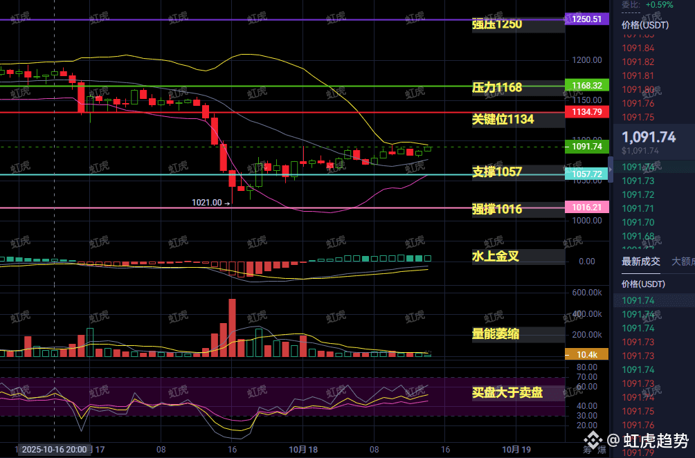看这张图!BNB在1134-1057区间缩量震荡,表面"买盘大于卖盘",但虹虎戳破谎言:量能萎缩暴露主力阴谋!