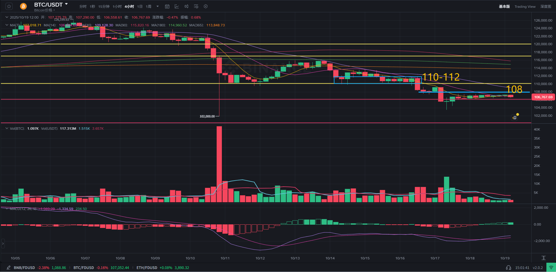 上週五的下行行情,可界定爲二次探底過程中的修復性補跌,隨後市場進入爲期 48 小時的窄幅整理階段。從 4 小時級別 K 線來看,當前行情已進入關鍵抉擇期:短期首要壓力位集中在 10.8 萬美元附近,上方核心壓力區間則位於 11.0-11.2 萬美元。若在週末窄幅震盪的基礎上,市場能釋放成交量突破並站穩 11.2 萬美元關口,市場做多情緒有望得到有效激活;反之,若調整後行情再度掉頭向下,跌破 10.5 萬美元支撐,後續大概率將測試 10 萬美元整數關口的支撐強度。