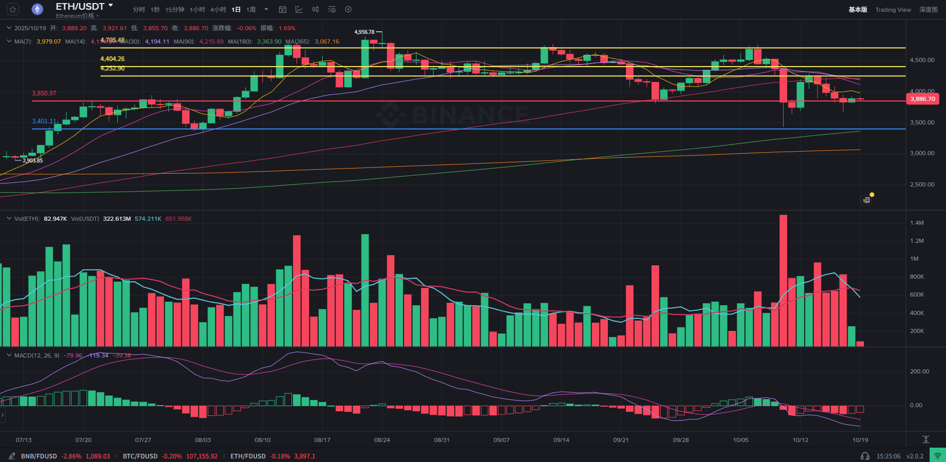 當前 ETH 價格運行於 3900 美元附近,處於 “跌破關鍵支撐後的首次震盪整理” 階段,屬於弱勢企穩範疇,並非趨勢性止跌反轉信號。技術形態上,短期均線(MA7/MA14/MA30)全部轉向下行,價格持續運行於所有短中期均線下方,形成完整的空頭排列結構。中長期支撐位分別對應 MA180 均線(3350 美元)與 MA365 均線(3080 美元),從大週期維度來看,當前 ETH 仍存在較大下行空間,階段性下跌趨勢未改。