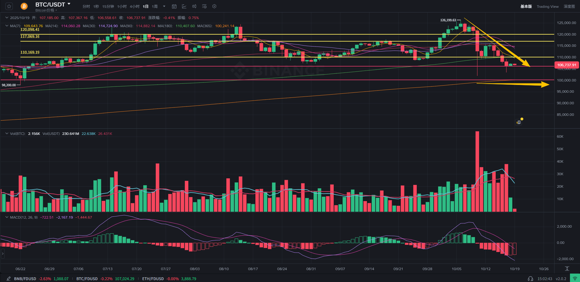 日線級別呈現明顯空頭趨勢特徵:短期均線(MA7/MA14)形成死叉後持續向下壓制價格,且已下穿 MA30 與 MA60 均線;中長期維度下,MA365 日均線(約 10 萬美元處)成爲多頭重要防守線。成交量層面,前期下跌過程中伴隨持續放量,進一步確認了空頭趨勢的有效性;近兩日成交量萎縮,表明市場暫入觀望狀態,但這種縮量調整通常預示下跌趨勢尚未終結,需持續等待明確的止跌信號。MACD 指標方面,快慢線維持大幅死叉向下擴散態勢,綠柱持續放大,顯示空頭動能仍處於強勢階段,短期暫無反轉跡象,唯有當 MACD 綠柱出現縮短趨勢時,纔可能迎來初步止跌信號。日內操作層面,上方重點關注 10.8 萬美元壓力位,進一步壓力需看 11.0 萬美元;下方則需留意 10.5 萬美元關鍵支撐。