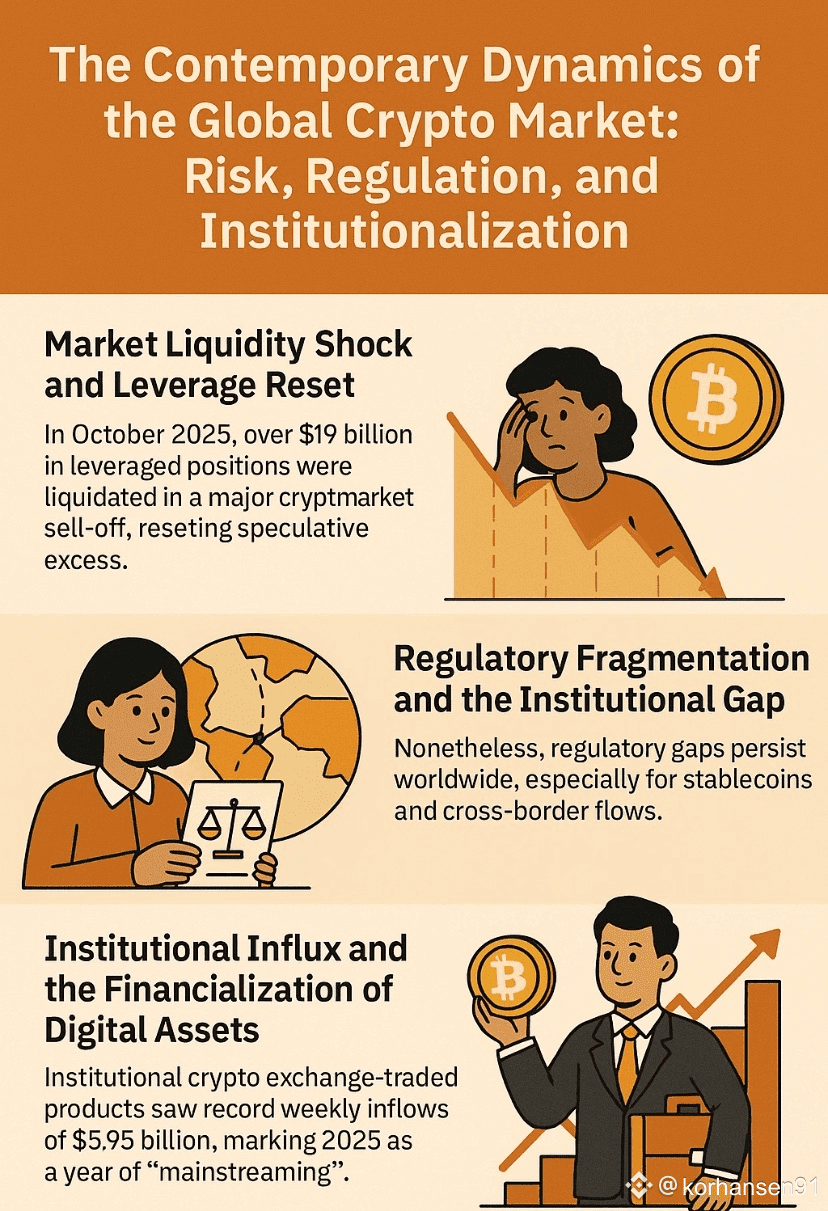 #Write2Earn The global crypto economy of 2025 has entered a decisive phase of structural transformation, marked by intensified volatility, tightening regulation, and accelerating institutional integration. What began as a decentralized experiment in digital value has matured into a complex, hybrid financial ecosystem that both mirrors and challenges the traditional economy. Over the past decade, the market’s exponential growth has brought not only innovation lol but also systemic stress from speculative excesses and liquidity shocks to fragmented governance and cross-border inconsistencies.