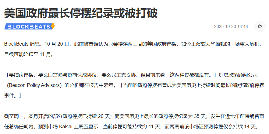 根據BlockBeats最新情報,原本預計僅持續2-3周的美國政府停擺已演變爲重大政治危機!燈塔政策顧問公司緊急預警,這場停擺極可能延續至11月並突破35天曆史紀錄。預測市場Kalshi數據顯示停擺週期將達41天,較兩週前預測暴漲300%!這場政治風暴正在成爲加密貨幣市場的終極催化劑!