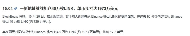 我是米格,剛纔我的預警系統響了。不是因爲技術指標走了多漂亮,而是因爲我監測到一條40萬枚LINK 的鉅額提幣!這頭“巨鯨”在兩天裏,已經悄無聲息地從幣安搬走了1973萬美元的籌碼!