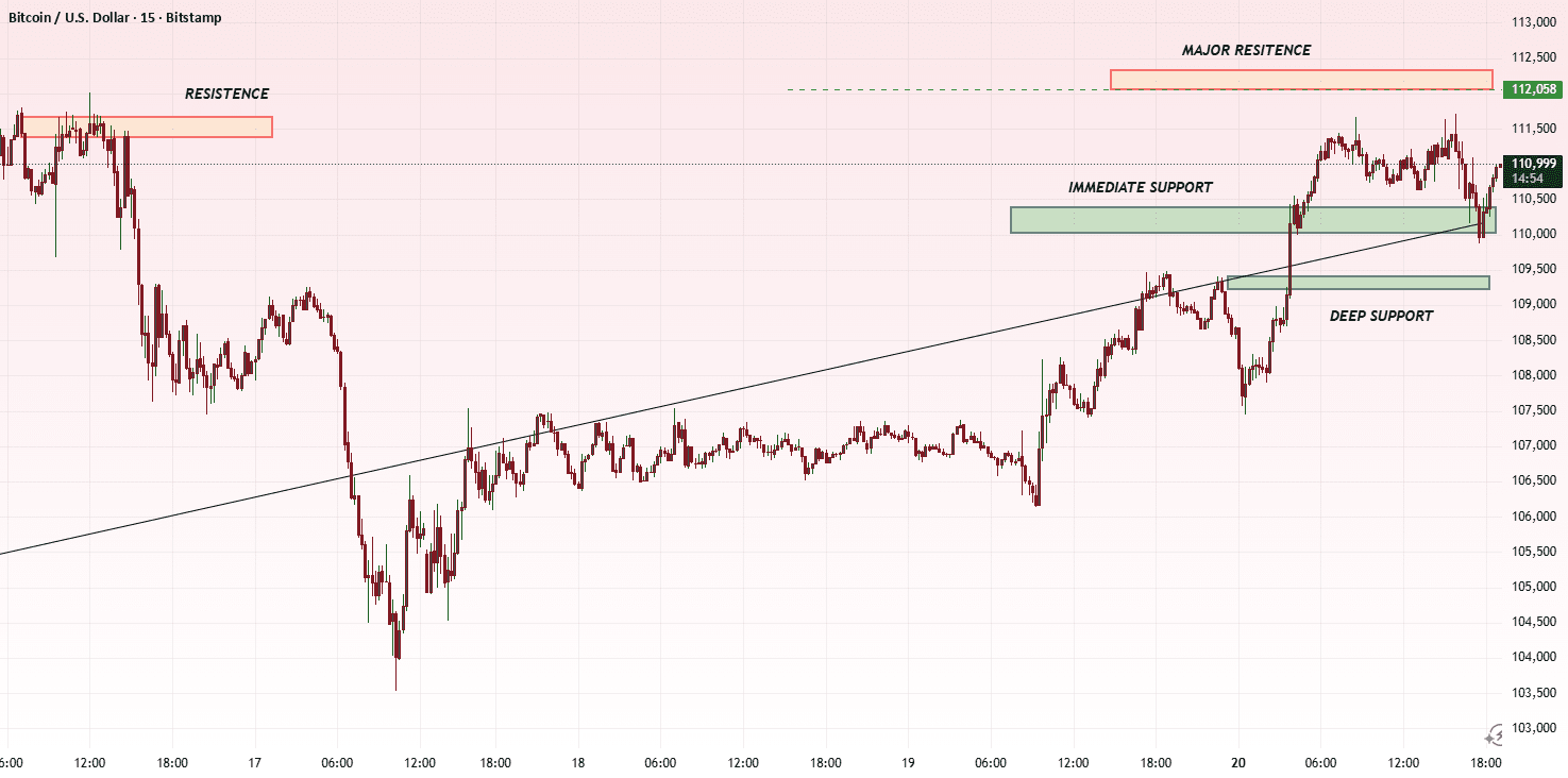 比特幣在110,800美元附近震蕩,接近111,800–112,000美元的阻力區域,先前的高點顯示出疲勞的跡象。