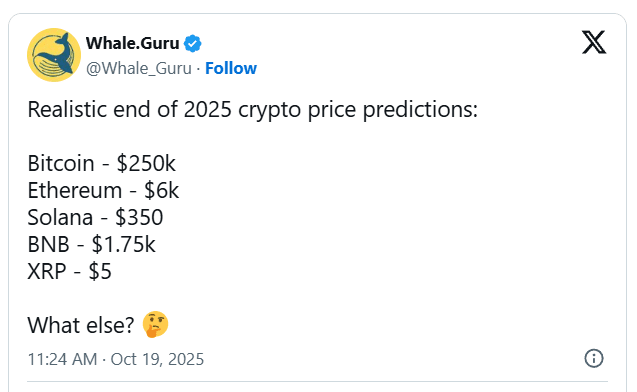 $XRP 加密市場分析師 Whale.Guru,在社區中被廣泛稱爲“100倍寶石獵人”,分享了主要數字資產的新價格預測,包括比特幣(BTC)、以太坊(ETH)和 XRP。他的更新預測表明整體溫和增長,並提出了他所稱的 2025 年剩餘時間內更現實的展望。