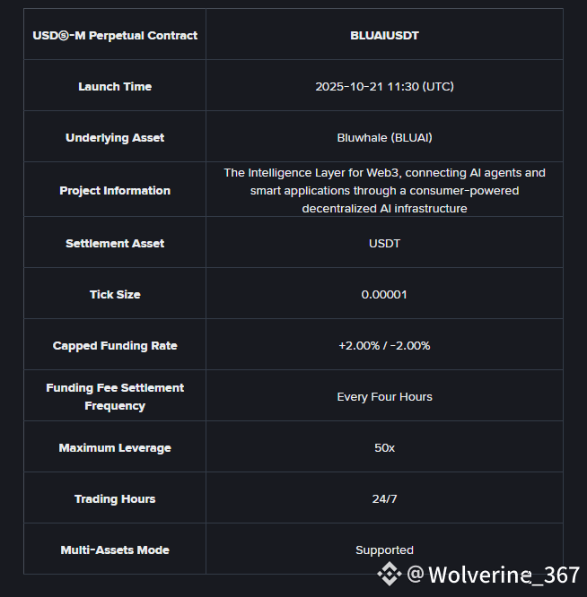 Binance is excited to announce that Bluwhale (BLUAI) will open for trading on Binance Alpha starting 2025-10-21 11:00 (UTC). In addition, Binance Futures will launch BLUAIUSDT Perpetual Contract with up to 50x leverage at 2025-10-21 11:30 (UTC).#Bluwhale $BLUAI
