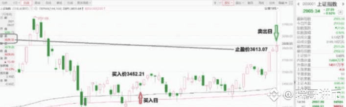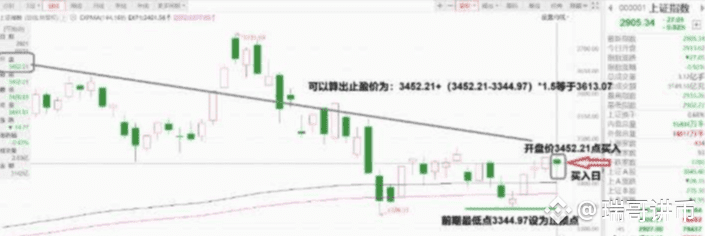 第二天开盘价3452.21点买入,同时将前期低点3344.97设为止损价,止盈价算出来是3613.07点
