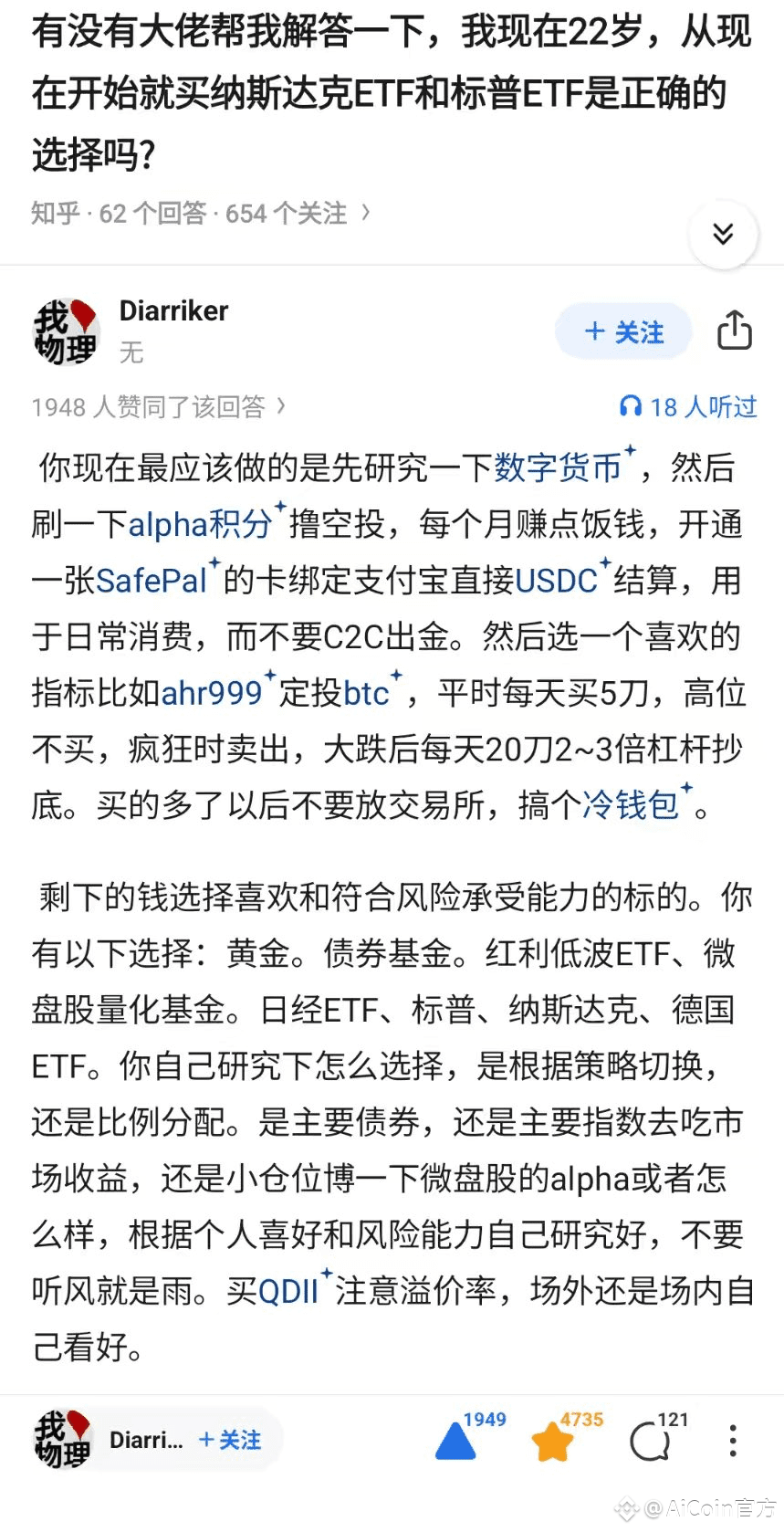 而最近刷到《人生作弊法则》这个帖子在推特上很火,我认为也很好回答了这个问题。该回答大意是:先研究数字货币,通过刷 Alpha 撸空投积累资金,再开一张 SafePal 的卡把撸空投赚的钱用于日常消费,再选择一个定投指标 AHR999 定投 BTC,剩下的钱就选择合适的标的投资即可。今天,我们就来介绍一下定投和如何使用 AHR999 定投指标,让你慢慢变富,不再为爆仓困扰!