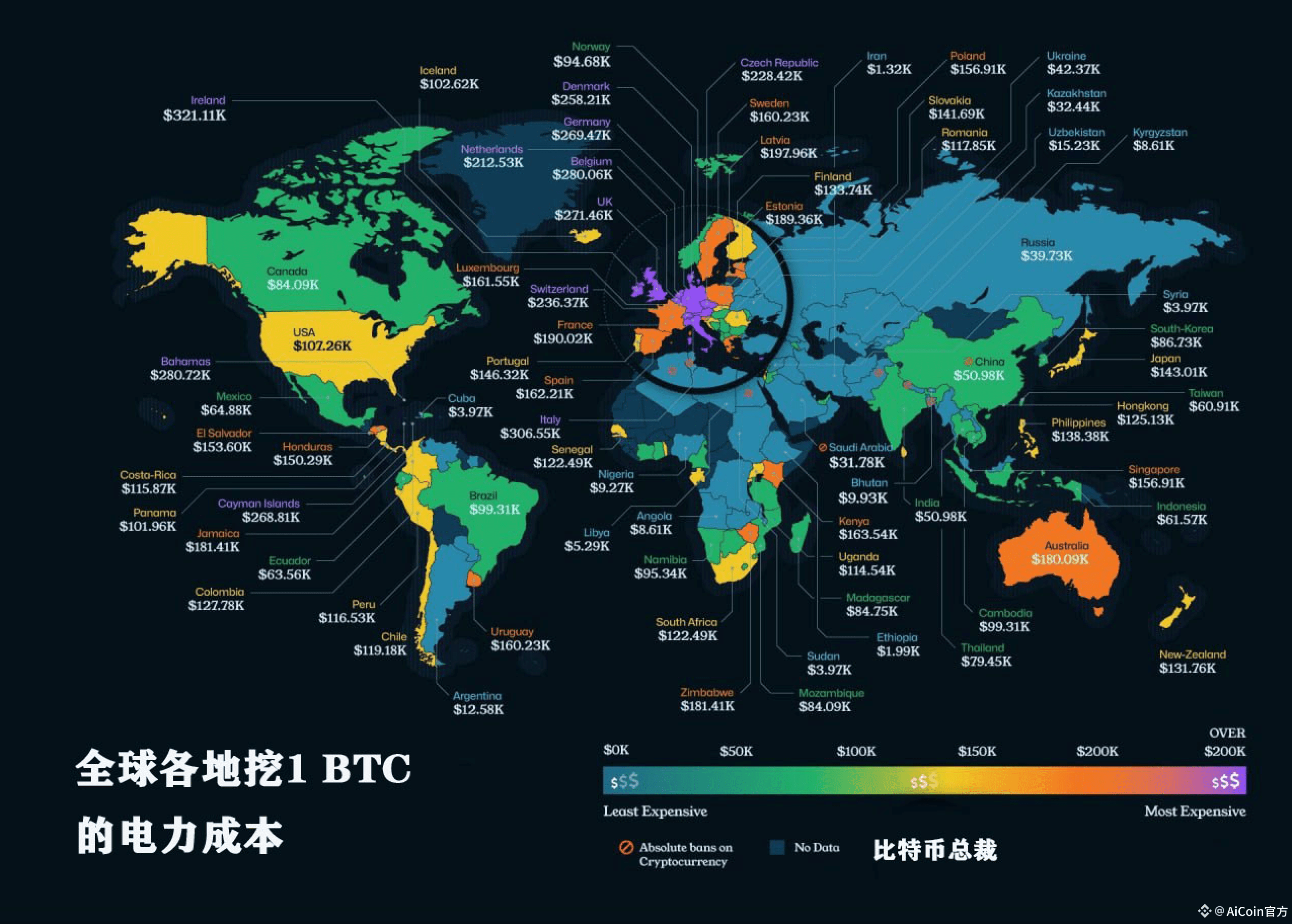 根据九神的观点 “比特币价格的下限是当前主流矿机的电费成本”,现在我们来拆解一下现在 1 枚 BTC 的大概成本:根据全球各地挖 1 BTC 的成本和比特币挖矿地图各地占比可以计算出 BTC 的全球平均成本,其中中国约占全球算力的 20%,哈萨克斯坦约占 15%,俄罗斯约占 5%,美国约占 40%,加拿大约占 5%,世界其他地区约占 15%。各地区算力占比对应相乘其电力成本可得全球 BTC 平均成本约为 7 万左右,低于这个价格全球大部份的矿机都会关机停产,转而购买 BTC。