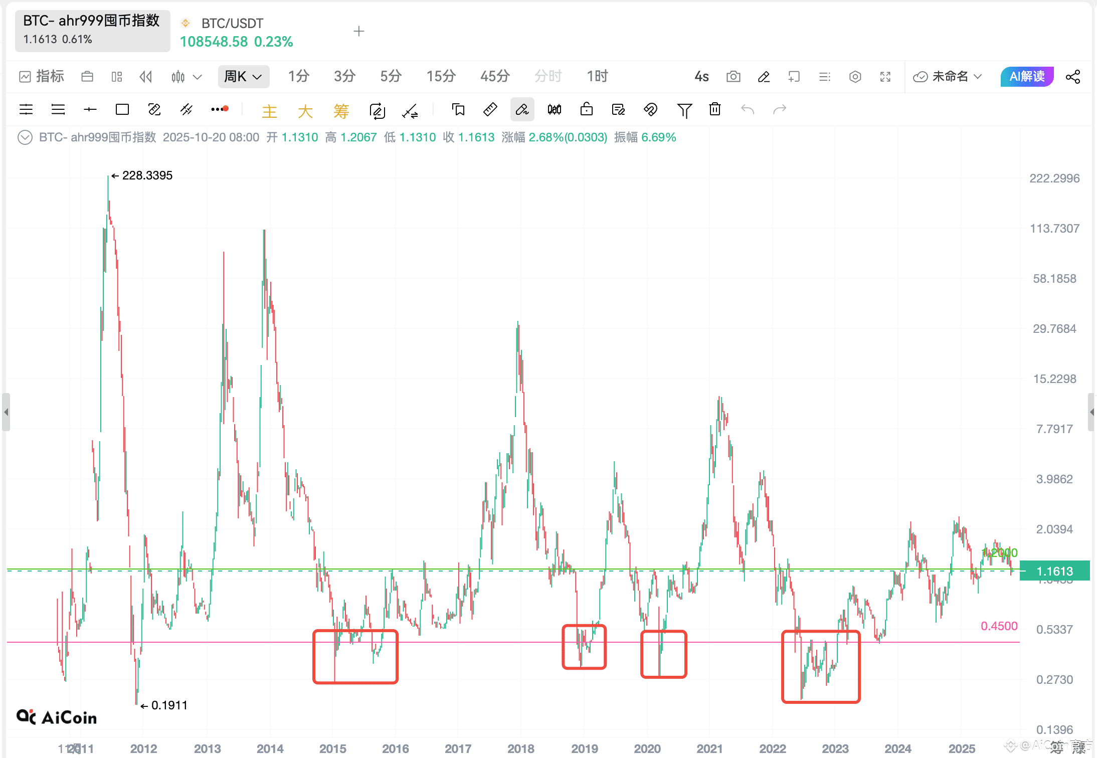 在过去多个周期中,AHR999 < 0.45 时,几乎都对应了极佳的长期买入时机(比如 2015 年、2018 年末、2022 年底的几次低点);而当 AHR999 超过 2.0,往往伴随市场情绪亢奋、牛市后期见顶。