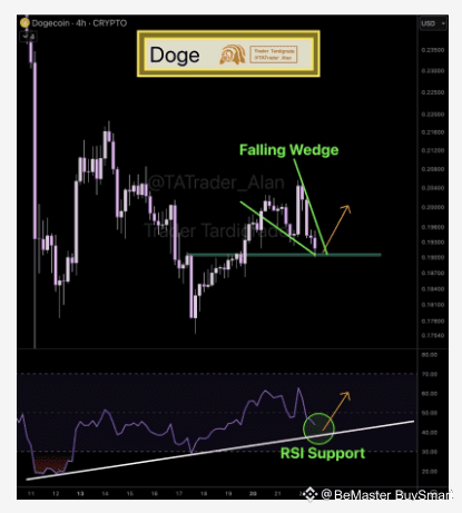 Dogecoin ($DOGE ) is forming a falling wedge pattern near the $0.19 support zone while RSI maintains an upward trendline — a setup often linked with renewed bullish momentum.