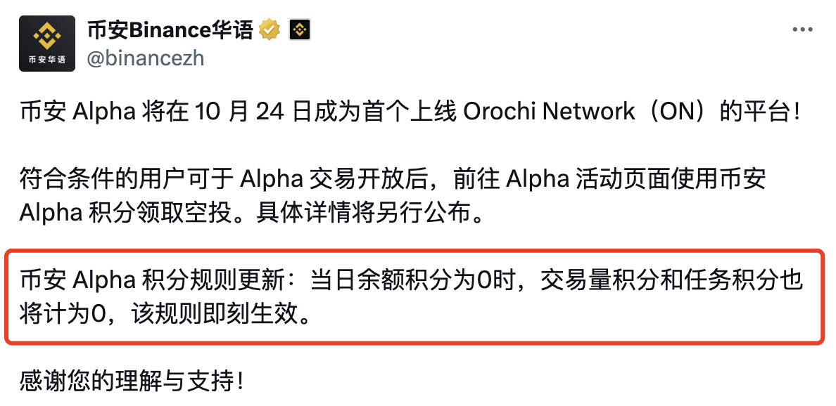 據幣安官方公告(2025年10月22日下午4點發布),Binance Alpha 積分系統迎來一項關鍵調整: