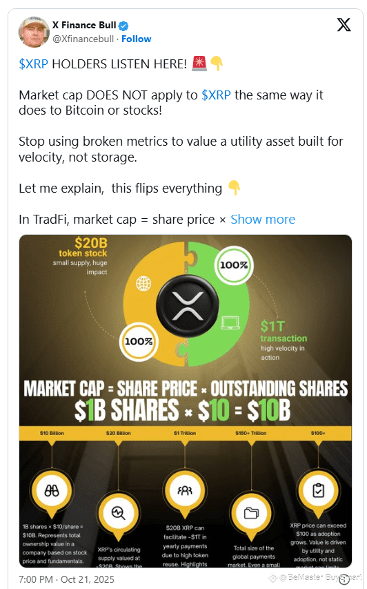 Unlike stocks or Bitcoin, where holding defines value, XRP’s power lies in its circulation and transaction velocity. Market cap, which assumes a static asset pool, cannot accurately capture that kind of dynamic utility.