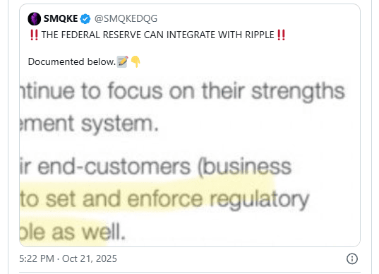 SMQKE’s findings add clarity to Ripple’s broader institutional ties, confirming that the company’s integration into formal payment networks extends beyond speculation. The information shared reinforces Ripple’s positioning within both the U.S. and global financial architecture as it continues to advocate for faster, more efficient cross-border transactions.