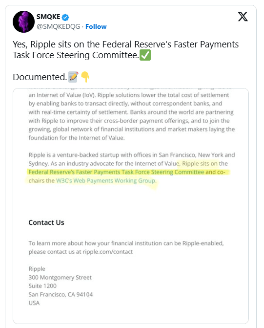 $XRP Crypto researcher SMQKE has presented direct evidence confirming Ripple’s participation in the Federal Reserve’s Faster Payments Task Force Steering Committee.