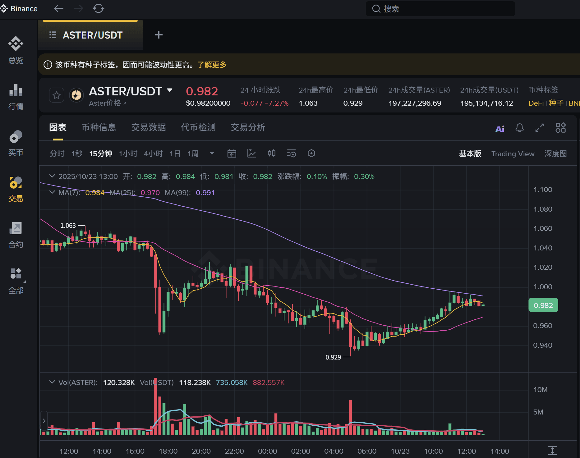 咱先看技術面。從你給的15分鐘圖來看,$ASTER 正在走一個類似Hyperliquid早期的圓弧底反轉形態。MA7已經跌到0.971,MA25在0.980,MA99還高高在上掛着1.028。這什麼意思?短期均線全部死叉,空頭佔據絕對優勢。但是!注意那個成交量柱狀圖,最近幾根綠柱子明顯比前面萎縮了,這說明拋壓在遞減。